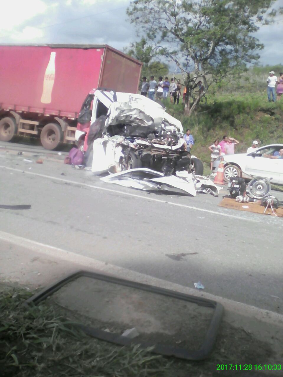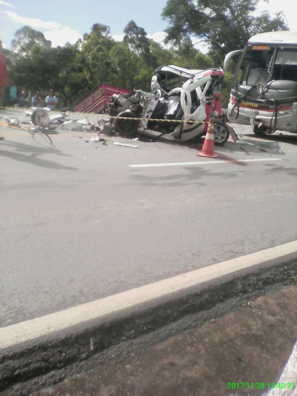 Um ônibus da Saritur também se envolveu no acidente deixando um saldo de quatro vítimas fatais confirmadas por agente da polícia Rodoviária, sendo todas elas ocupantes da Doblô.