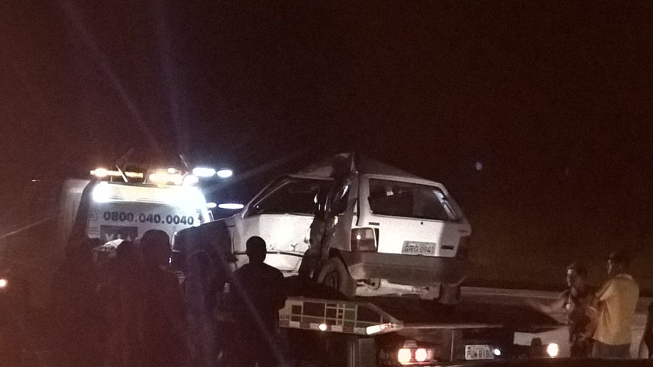 A motocicleta colidiu com a lateral do carro no lado do motorista e a força do impacto fez com o que o Uno tomabasse na pista.
