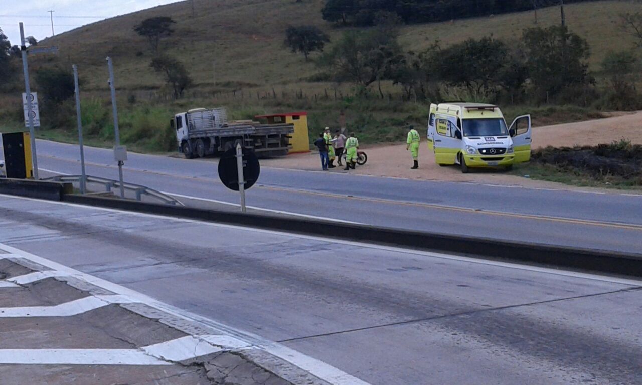 Uma motocicleta com placa de Caranaíba que seguia logo atrás não conseguiu parar a tempo e o motociclista foi jogado ao chão e por pouco nao foi atropelado por um outro caminhão.