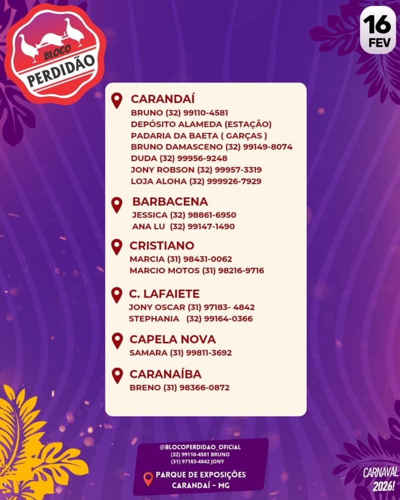 O clima de carnaval já começa a tomar conta da região com o anúncio oficial do Bloco Perdidão 2026 que acontece no dia 16 de fevereiro, a partir das 19h.