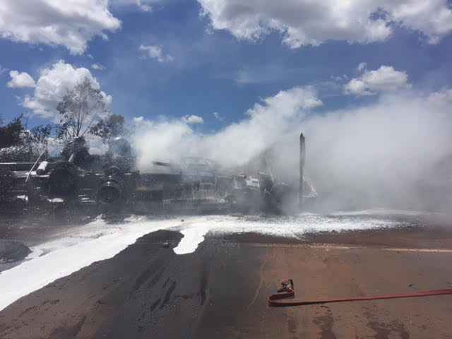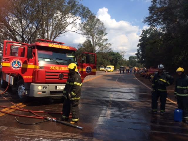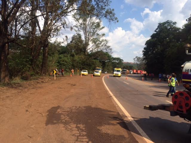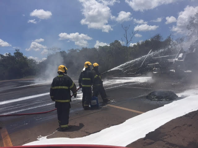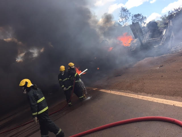 Por razões ainda desconhecidas o caminhão Mercedes Benz licenciado em Betim-MG que seguia no sentido Rio de Janeiro e transportava 15 mil litros de óleo diesel tombou na pista iniciando em seguida um incêndio no veículo, bem como na vegetação das margens da rodovia.