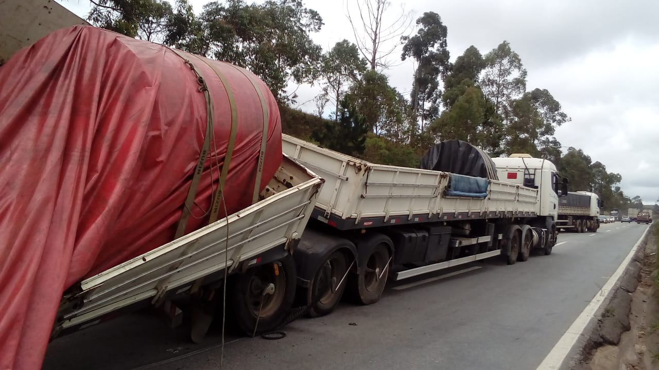 Uma carreta bi trem de placa FRR1086 que transportava chapa de aço também perdeu parte do controle do veículo ao passar pelo curva de Hermilo Alves e acabou tombando na pista enquanto o motorista seguia viagem sentido Barbacena.