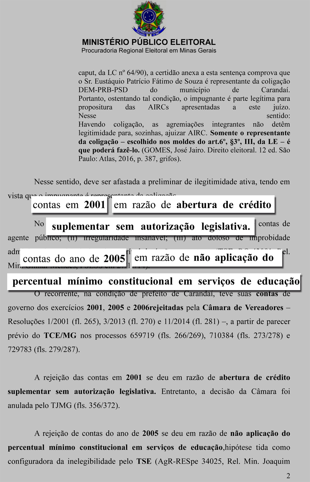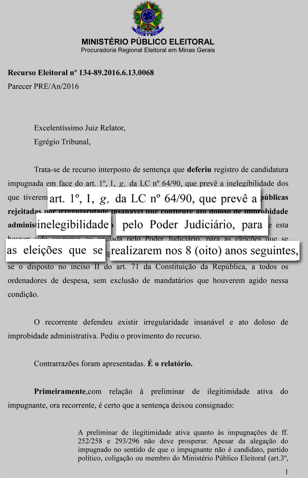 O recurso interposto de sentença de primeiro grau do candidato Moacir Tostes de Oliveira que deferiu o registro de candidatura impugnada teve na data do último dia 23 teve um novo parecer que foi publicado e divulgado pelo Ministério Público Eleitoral.