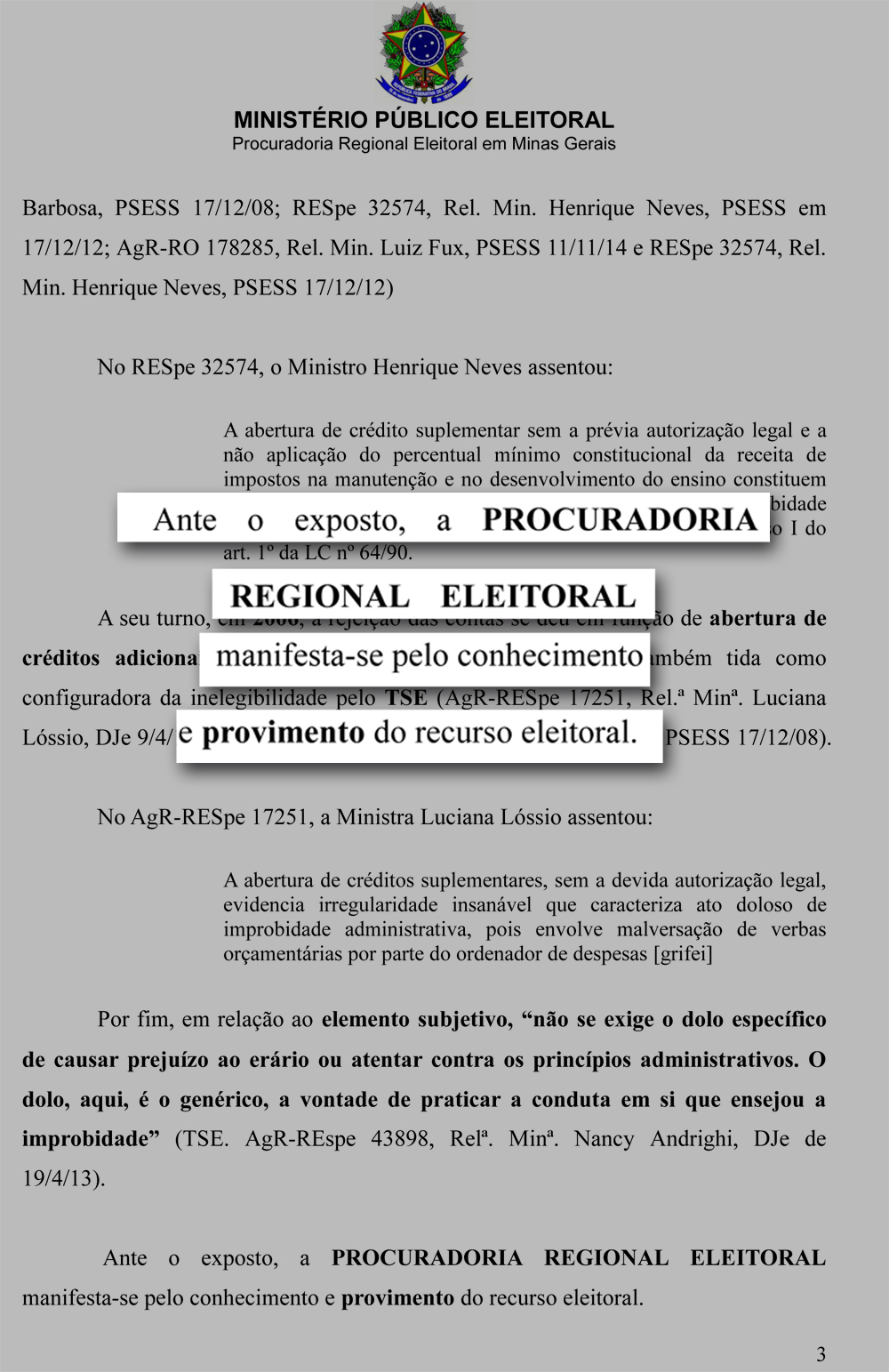 Ainda em relação à reprovação destas contas, o procurador cita que “não se exige o dolo específico de causar prejuízo aos cofres públicos ou atentar contra os princípios administrativos. O dolo, é genérico, a vontade de praticar a conduta em si que ensejou a improbidade”.