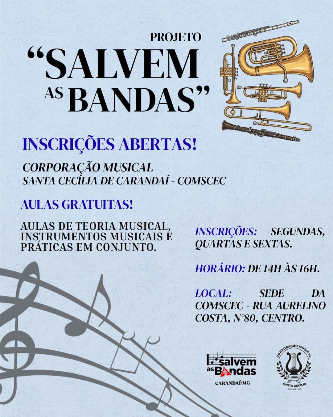 A Corporação Musical Santa Cecília de Carandaí (COMSEC) está com inscrições abertas para o projeto “Salvem as Bandas”, iniciativa que tem como objetivo incentivar o aprendizado musical e formar novos integrantes para a tradicional banda da cidade.