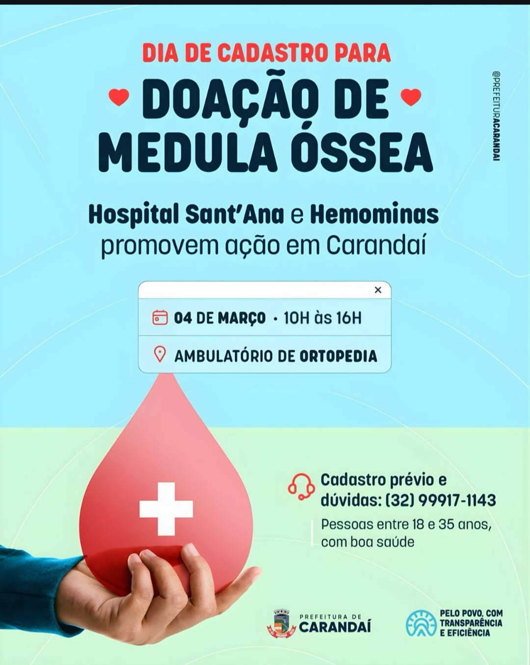 Uma ação solidária voltada à saúde e à esperança de pacientes será realizada em Carandaí. O Hospital Sant’Ana, em parceria com a Fundação Hemominas, promove um dia de cadastro para doação de medula óssea, com o objetivo de ampliar o número de doadores e salvar vidas.