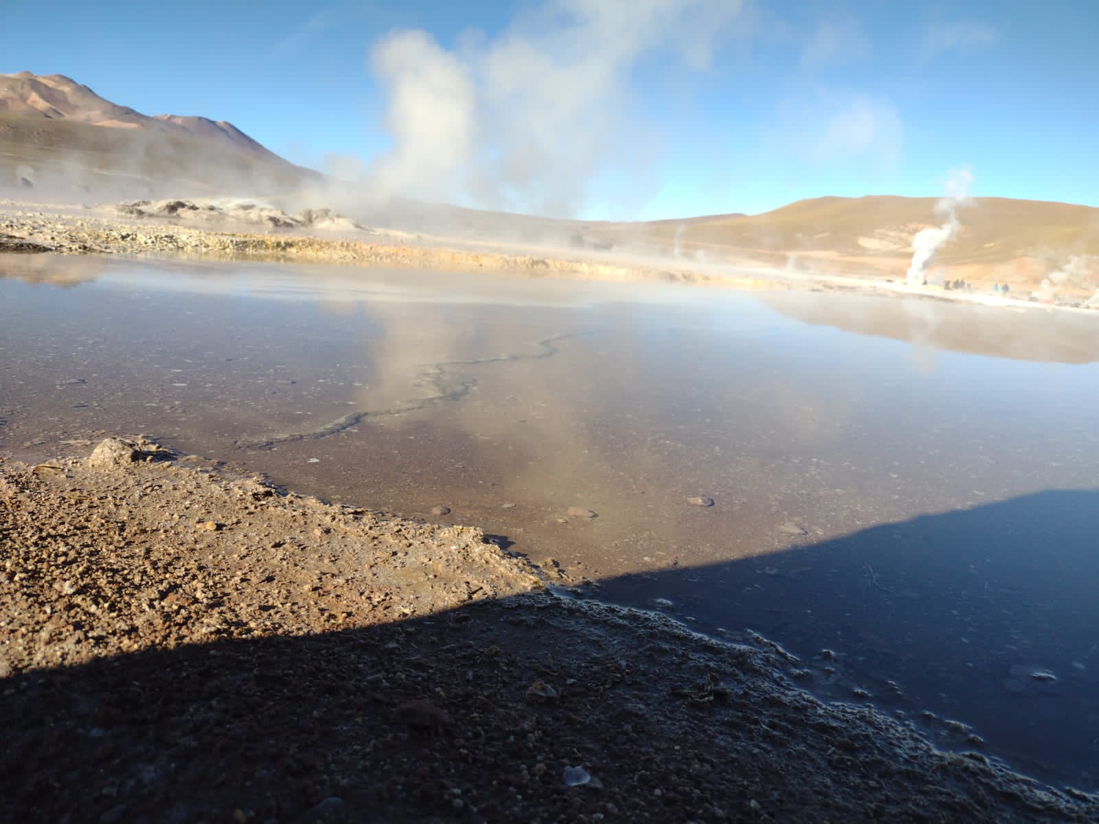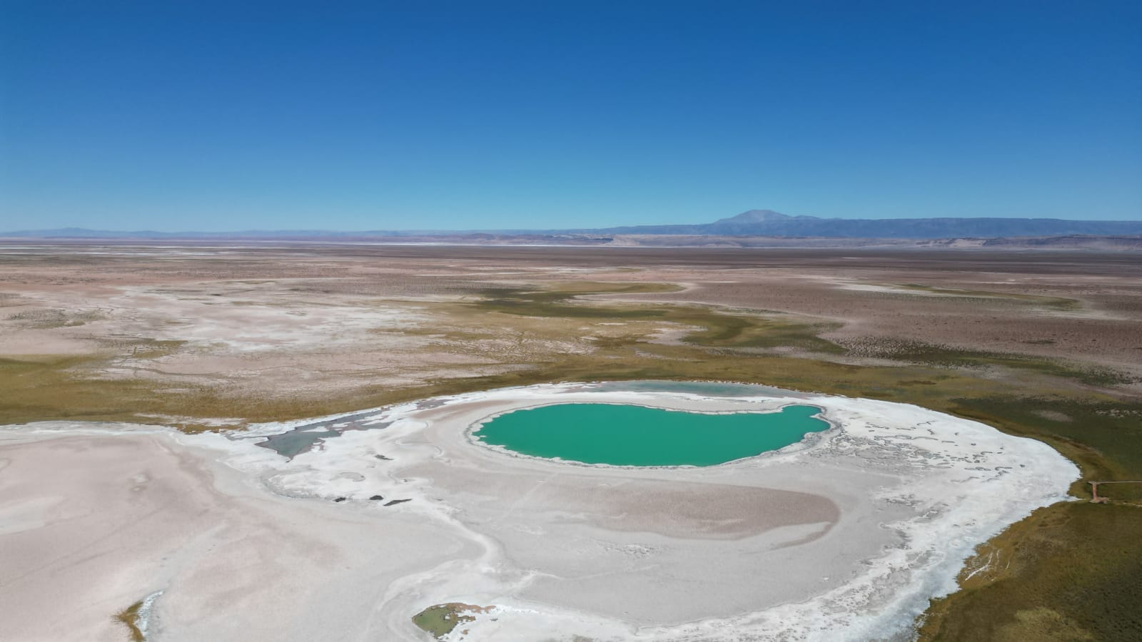 Localizada a 16 quilômetros de San Pedro de Atacama, uma maravilhosa mistura de cores esmeralda e azul com vista para o vulcão Licancabur e a Cordilheira do Sal, seus cristais de sal brilham ao sol como diamantes em um dia em que o sol ilumina um céu o indifo de cor azul perfeito.