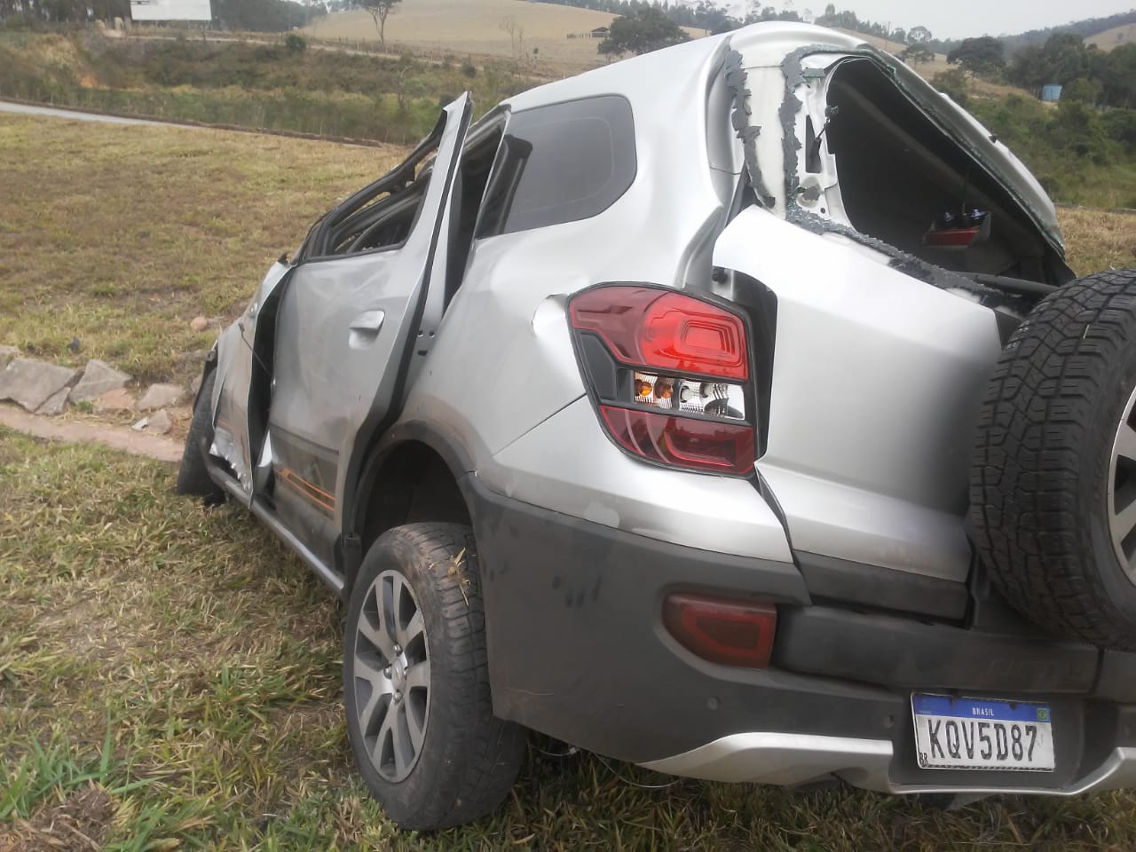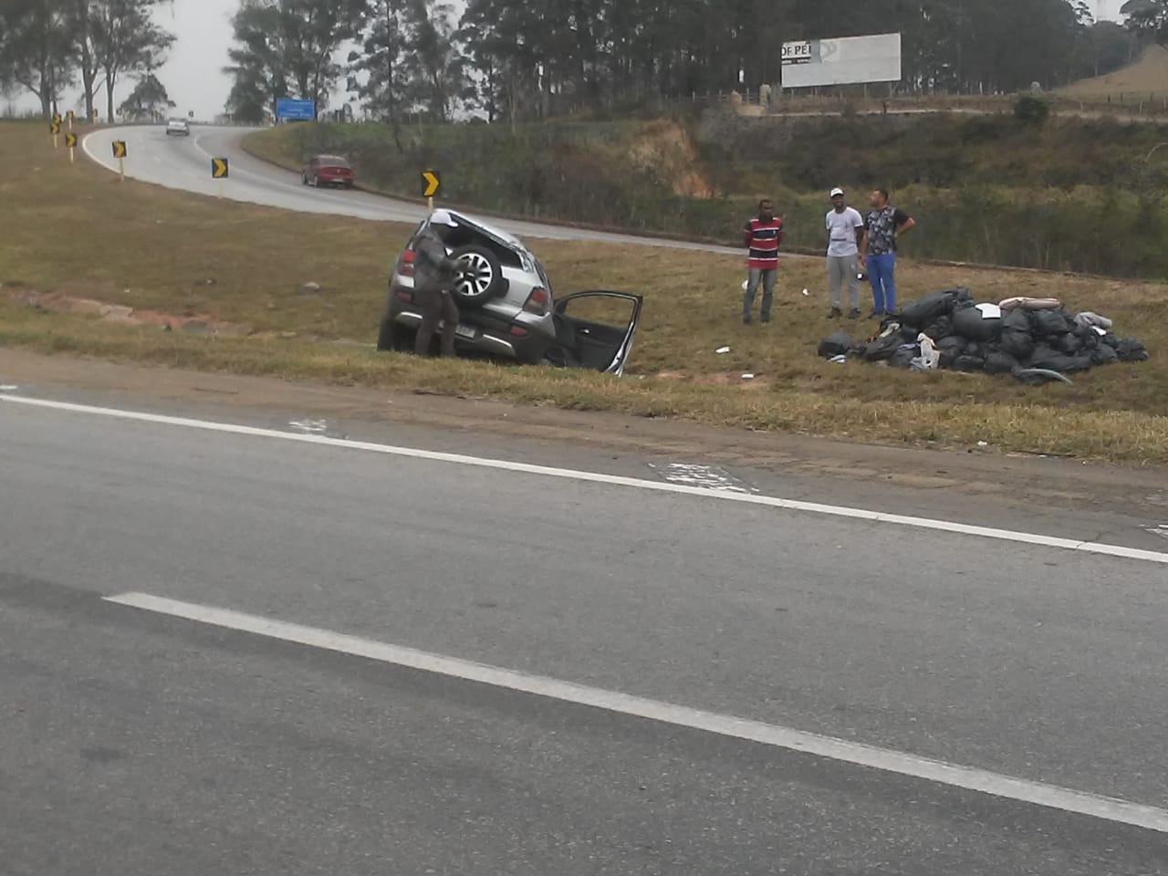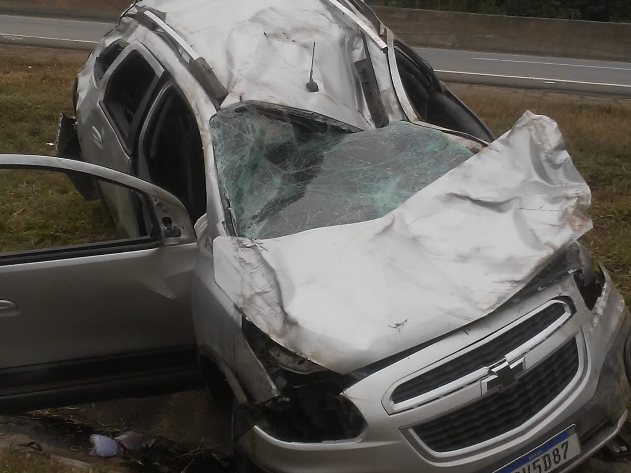 Um Chevrolet Spin com dois ocupantes oriundos do Rio de Janeiro acabou perdendo o controle do carro ao entrar na curva e logo após o veículo veio a capotar parando com a rodas para cima em um canteiro central próximo a curva.