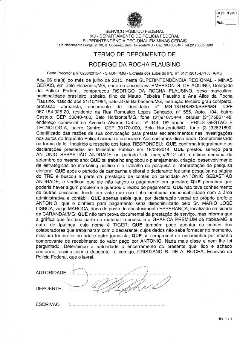 A reportagem conseguiu copia do termo de depoimento de Rodrigo Flausino à Polícia Federal e também um recibo assinado pelo próprio prefeito professor Pelé onde ele atesta o pagamento de 15 mil reais ao jornalista.