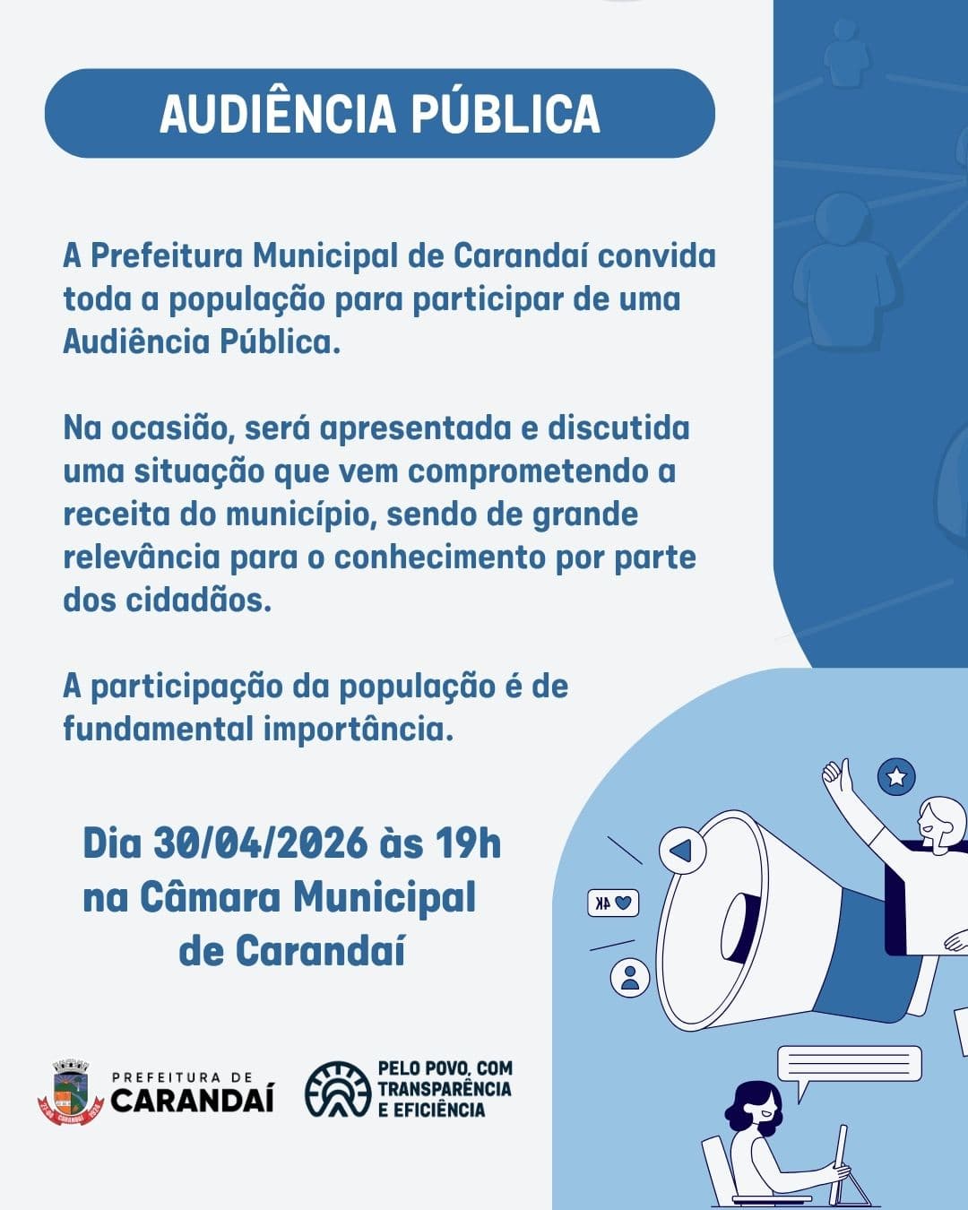 A Prefeitura Municipal de Carandaí divulgou convite oficial à população para participar de uma audiência pública que será realizada nesta quarta-feira às 19h na Câmara Municipal.
