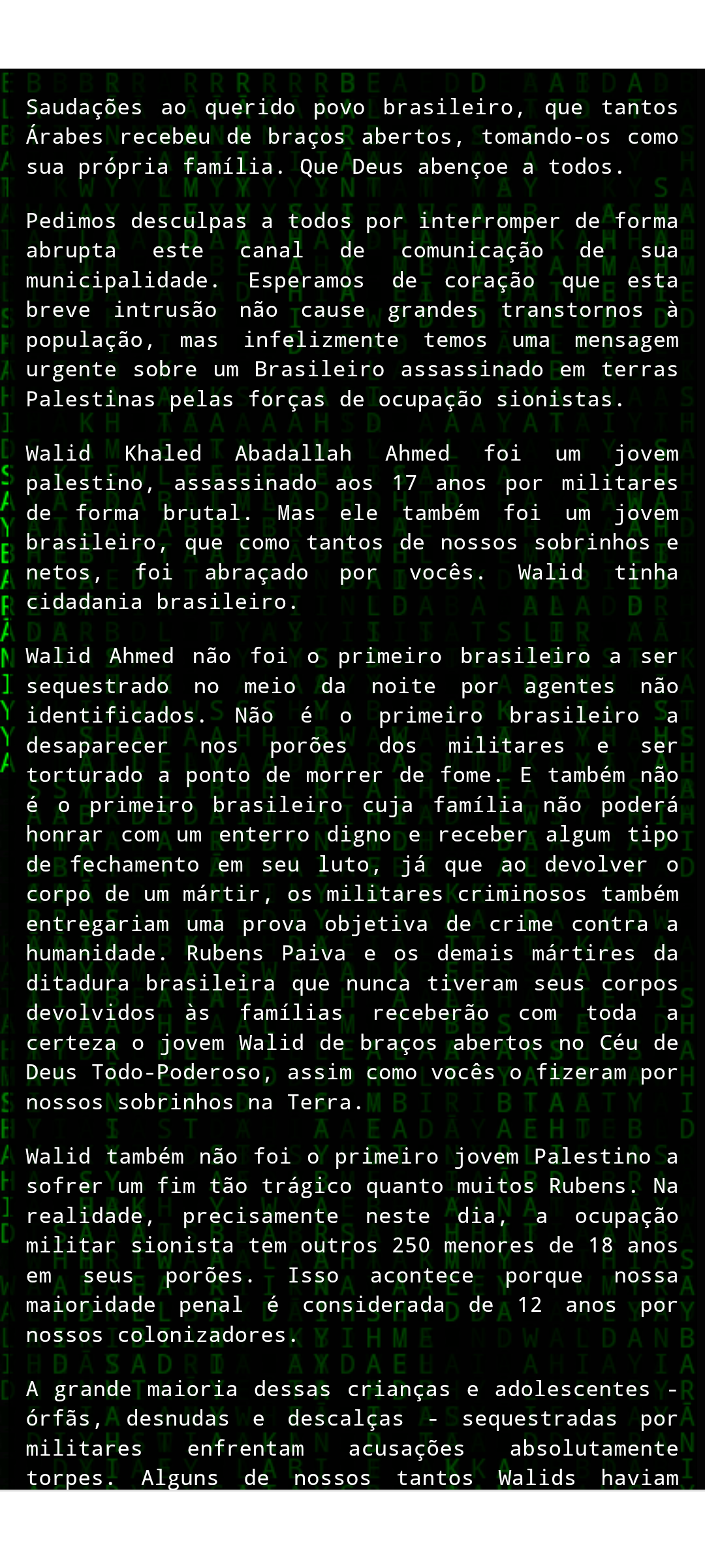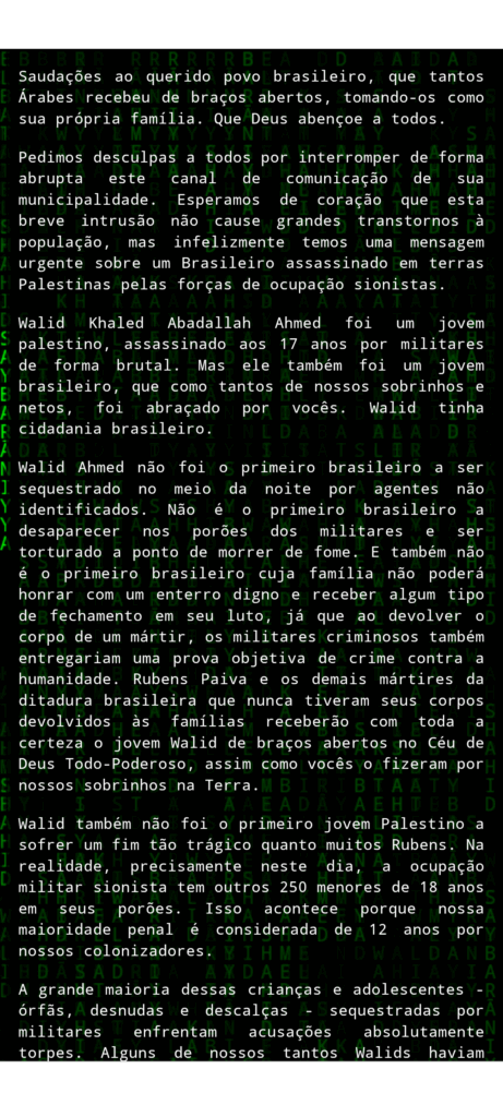 Site da Prefeitura de Carandaí é invadido por hackers com mensagem sobre jovem palestino morto.