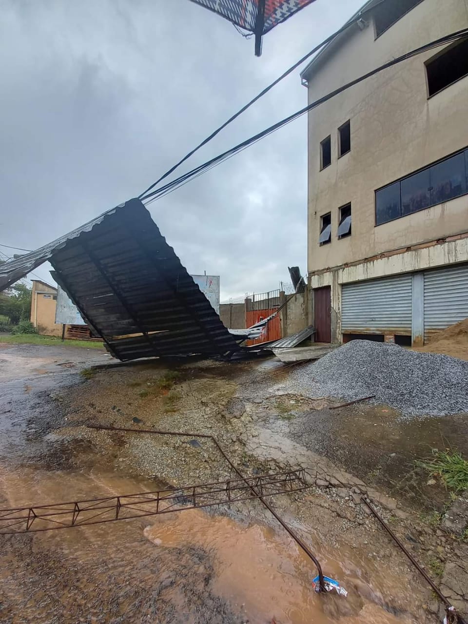 Em dois pontos da cidade, telhas também voaram com a força do vento, onde uma grande estrutura de metal parou em uma das ruas da entrada da cidade e uma outra grande estrutura metálica também foi parar em cima de um poste em frente a delegacia de policia civil.