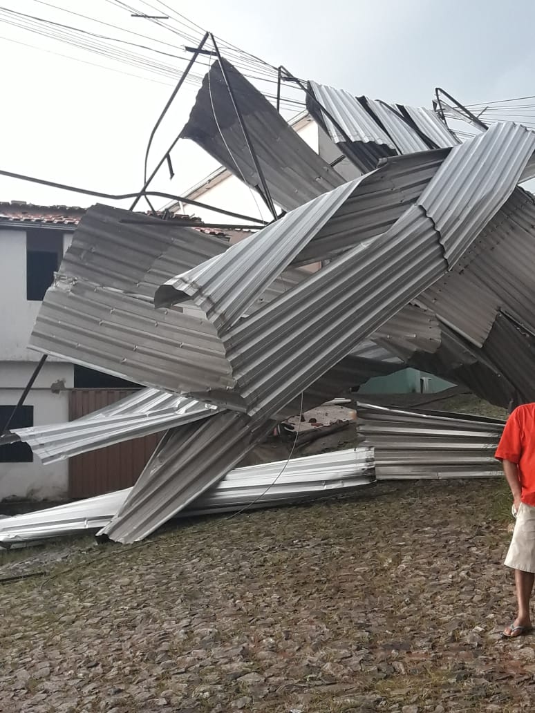 A cidade que amanheceu com o calçadão novamente inundado sofreu uma nova pancada de chuva, rápida porém suficiente para destelhar casas e derrubar arvores.