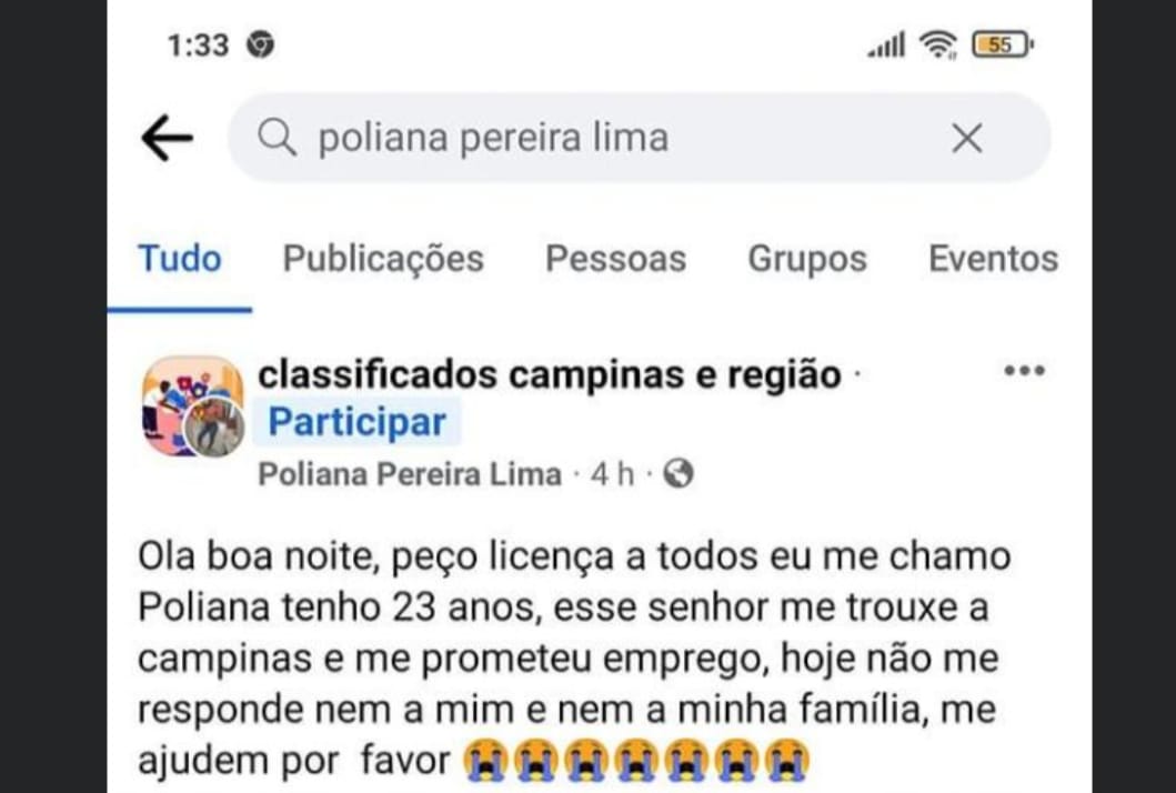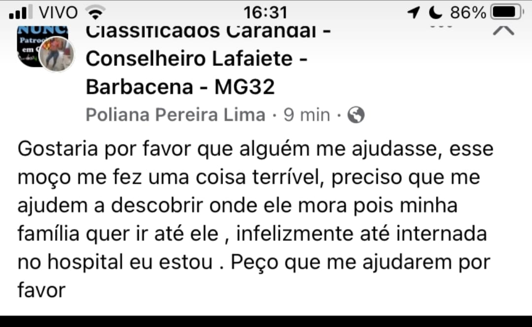 Em um grupo de classificados da cidade, um perfil aparentemente de uma jovem de Lafaiete publicou sua foto e perguntou se alguém o conhecia e logo após afirmou que o mesmo teria feito uma “coisa terrível” contra ela e que sua família precisava localiza lo.