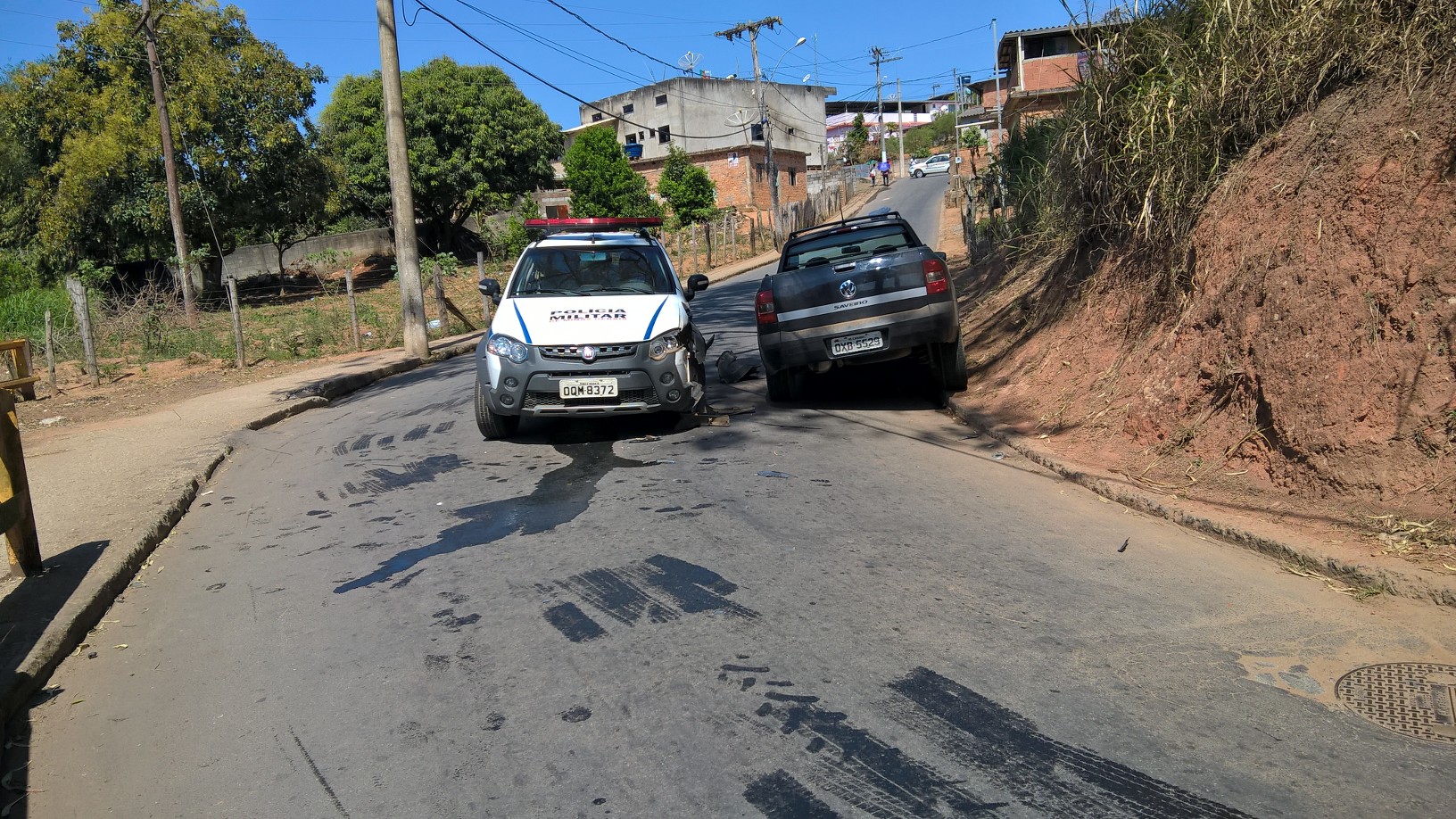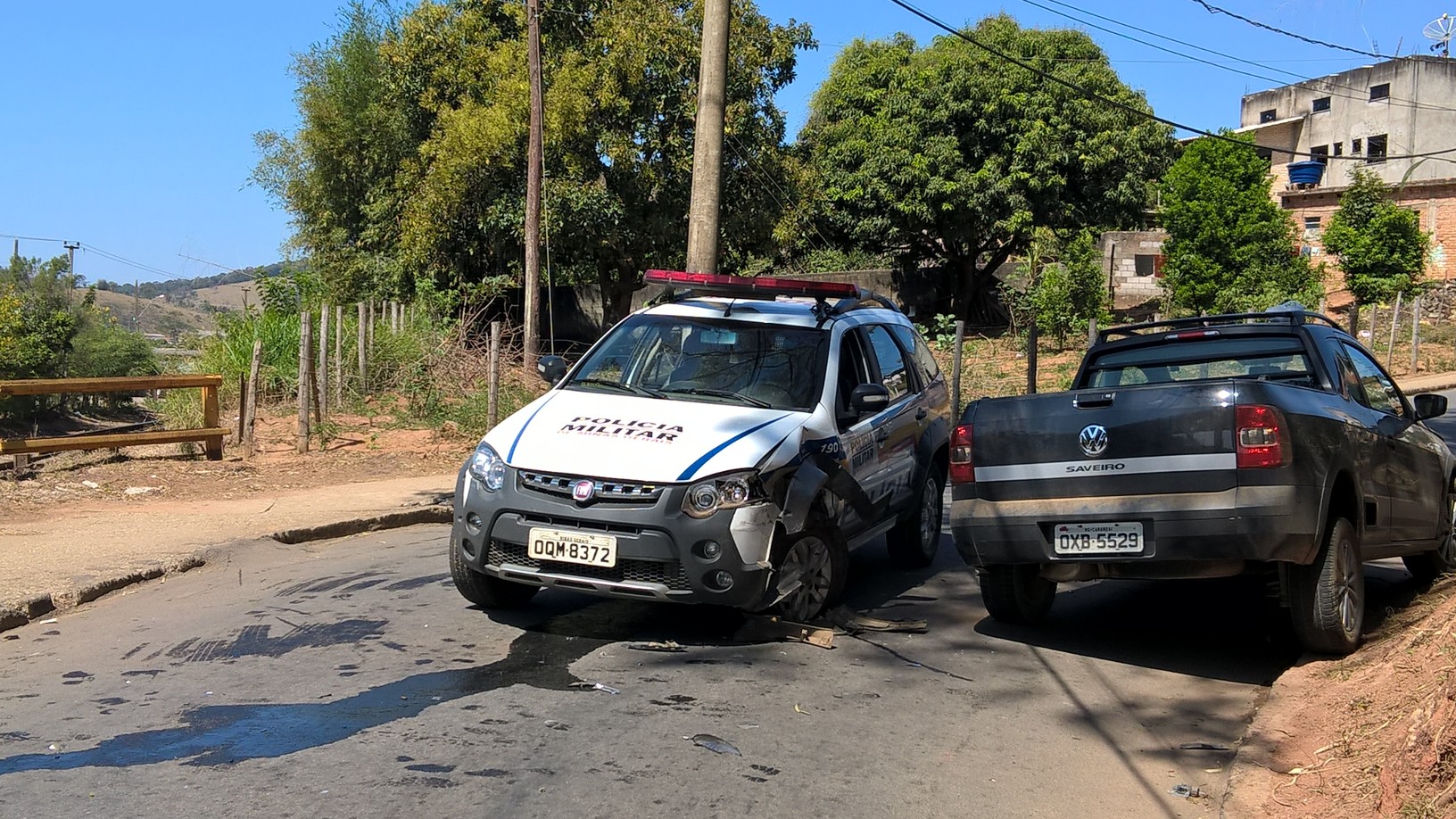 Por volta de 13hs uma viatura da Policia militar descia sentido bairro Praia quando colidiu com uma pick up Saveiro que fazia o caminho inverso sentido Ponte Chave.